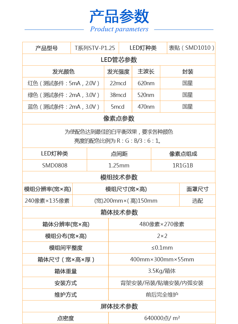 LED大屏幕小間距拼接全彩高清屏 背光源:LED背光 點間距:1.25 mm LED燈種類:SMD1010 顯示密度:640000點/㎡ 模組分辨率(寬×高):240像素×135像素 模組尺寸(寬×高):(寬)200mm×( 高)150mm 箱體分辨率(寬×高):480像素×270像素 模組分布(寬×高):2×2 箱體尺寸(寬×高×厚):400mm×300mm×55mm