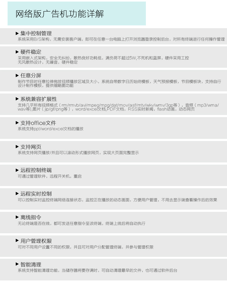 整合信息編輯、傳輸、播放以及終端管理、實時監控為一體,完整、專業的功能設置,全面滿足不同行業、不同需求的用戶。